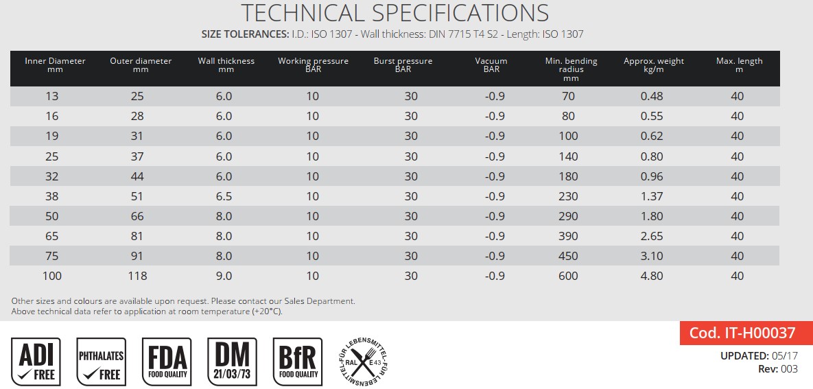 - Ống: cao su EDPM, màu sáng, không mùi vị, không độc hại, bề mặt trong phẳng và đạt tiêu chuẩn FDA