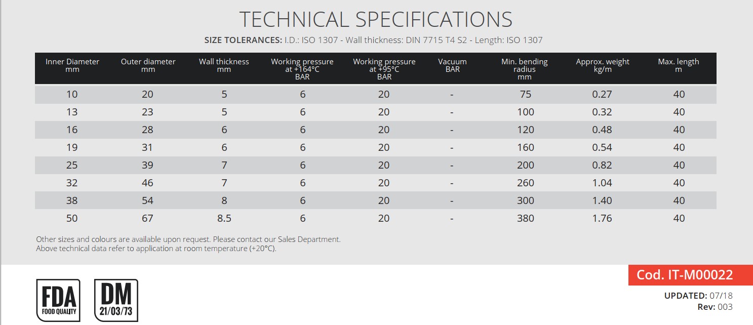 - Ống: cao su EDPM, màu sáng, không mùi vị, không độc hại, bề mặt trong phẳng và đạt tiêu chuẩn FDA